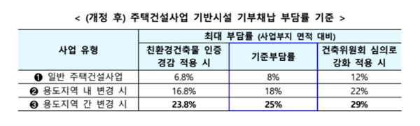 À̹ø °³Á¤¾È¿¡´Â ¿ëµµÁö¿ª °£ º¯°æ ½Ã ±â¹Ý½Ã¼³ ±âºÎä³³ »óÇÑÀÌ µµÀԵȴÙ. ÁÖÅûç¾÷ ÀΤýÇã°¡ ½Ã ¿ëµµÁö¿ª ³» º¯°æÀÌ ÀÌ·ïÁö´Â °æ¿ì ±âÁغδã·ü(8%)¿¡ 17%p¸¦ Ãß°¡ÇØ »ç¾÷ºÎÁö ¸éÀûÀÇ ÃÖ´ë 25%±îÁö¸¸ ±â¹Ý½Ã¼³ ±âºÎä³³À» ¿ä±¸ÇÒ ¼ö ÀÖµµ·Ï ÇÏ´Â ±ÔÁ¤À» ½Å¼³ÇÑ´Ù.