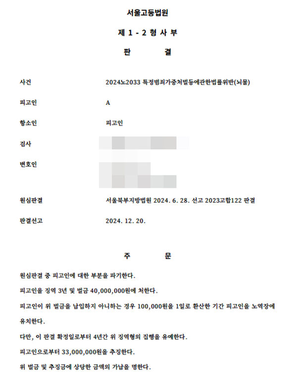 ÇÑ ¹ýÁ¶°è Àü¹®°¡´Â “¿©±â¼ A¾¾´Â ÃÖ±Ù±îÁö ¼¿ïºÏºÎÁö¹æ¹ý¿ø-¼¿ï°íµî¹ý¿ø-´ë¹ý¿øÀÇ ¡¸Æ¯Á¤¹üÁË °¡Áßó¹ú µî¿¡ °üÇÑ ¹ý·ü¡¹ ÆÇ°á¿¡ µû¶ó ³ú¹°°ø¿© µîÀÇ ¹üÁ˰¡ ÀÎÁ¤µÈ ¹Ù ÀÖ´Ù”¸é¼ “¼¿ï°íµî¹ý¿ø ÆÇ°á±îÁö ³»¿ë¿¡ µû¸£¸é A¾¾ÀÇ ÀçÆÇ °á°ú´Â ¡¿ª 3³â¿¡ ¹ú±Ý 4000¸¸ ¿ø(ÁýÇàÀ¯¿¹ 4³â)À̸ç Ãß¡±ÝÀº 3300¸¸ ¿ø¿¡ ´ÞÇß´Ù”¶ó°í ÁöÀûÇß´Ù.