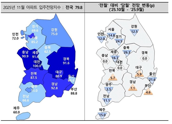 ¼öµµ±Ç ÀÔÁÖÀü¸ÁÁö¼ö´Â 75.6À¸·Î Àü¿ù(92.7)°ú ºñ±³ÇØ 17.1p Ç϶ôÇß´Ù. ¼¿ïÀº 85.2·Î Àü¿ù(100)º¸´Ù 14.8p, ÀÎõÀº 72·Î Àü¿ù(84)º¸´Ù 12p, °æ±â´Â 69.6À¸·Î Àü¿ù(94.1)º¸´Ù 24.5p °¢°¢ ³»·Á Ç϶ô ÆøÀÌ ÄÇ´Ù.