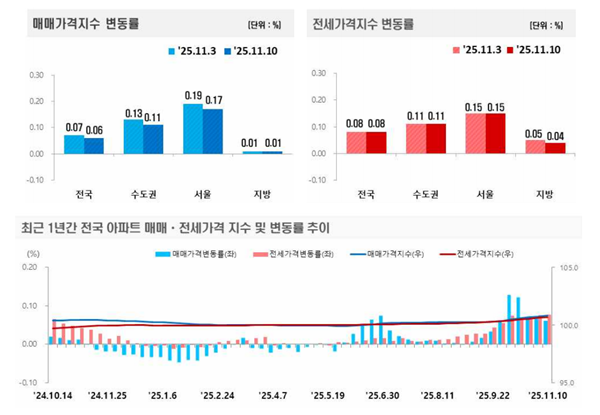 [¾ÆÀ¯°æÁ¦=±ÇÇýÁø ±âÀÚ] ÃÖ±Ù Çѱ¹ºÎµ¿»ê¿øÀÌ ¹ßÇ¥ÇÑ ‘ÁÖ°£¾ÆÆÄÆ® °¡°Ýµ¿Çâ’¿¡ µû¸£¸é 2025³â 11¿ù 2ÁÖ(Áö³ 10ÀÏ ±âÁØ) Àü±¹ ¾ÆÆÄÆ®°ªÀº »ó½Â(0.06%)À» ±â·ÏÇß´Ù. ¼öµµ±Ç°ú ¼¿ïÀº »ó½ÂÇß°í, Áö¹æÀº »ó½Â ÀüȯÇÑ »óȲÀÌ´Ù.