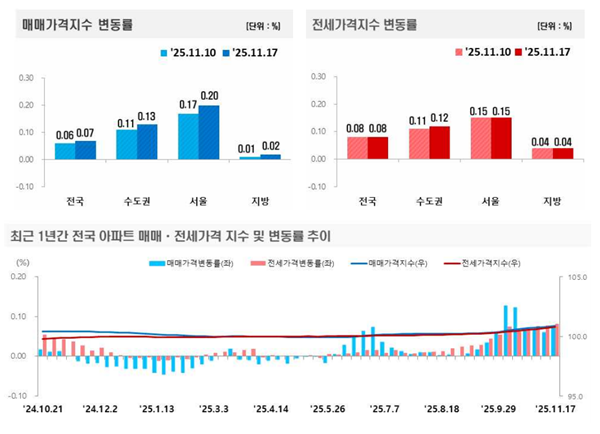 [¾ÆÀ¯°æÁ¦=±ÇÇýÁø ±âÀÚ] ÃÖ±Ù Çѱ¹ºÎµ¿»ê¿øÀÌ ¹ßÇ¥ÇÑ ‘ÁÖ°£¾ÆÆÄÆ® °¡°Ýµ¿Çâ’¿¡ µû¸£¸é 2025³â 11¿ù 3ÁÖ(Áö³ 17ÀÏ ±âÁØ) Àü±¹ ¾ÆÆÄÆ®°ªÀº »ó½Â(0.07%)À» ±â·ÏÇß´Ù. ¼öµµ±Ç°ú ¼¿ï, Áö¹æ ¸ðµÎ »ó½ÂÇß´Ù.
