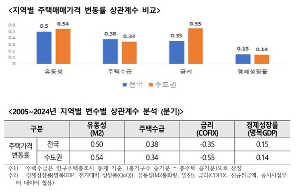 ÁÖÅûê¾÷¿¬±¸¿øÀº 2005³âºÎÅÍ 2024³â±îÁö ÁÖÅà ¸Å¸Å°¡°Ý¿¡ ¿µÇâÀ» ¹ÌÄ¡´Â ¿äÀÎÀ» ´Ü¼ø»ó°ü°è¼ö·Î ºñ±³ÇØ º» °á°ú À¯µ¿¼º(ÅëÈ·® M2 ±âÁØ »ó°ü°è¼ö¤ý0.5)ÀÌ °¡Àå Å« ¿µÇâÀÌ ¹ÌÃÆ°í ´ÙÀ½À¸·Î´Â ÁÖÅà ¼ö±Þ(0.38)°ú ±Ý¸®(-0.35), °æÁ¦¼ºÀå·ü(0.15) ¼øÀ¸·Î ³ªÅ¸³µ´Ù°í ¹àÇû´Ù.