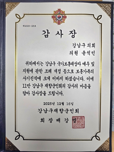 [¾ÆÀ¯°æÁ¦=Á¶Çö¿ì ±âÀÚ] °³²±¸ÀÇȸ À±¼®¹Î ÀÇ¿ø(°³Æ÷1¤ý2¤ý4µ¿)ÀÌ Áö³ 16ÀÏ ¿¸° °³²±¸ ÀçÇⱺÀÎȸ ÅëÇÕ µ¿ÃÑȸ¿¡¼ ±¹°¡º¸ÈÆ´ë»óÀÚ ¿¹¿ì ÁõÁø¿¡ ±â¿©ÇÑ °ø·Î·Î °¨»çÀåÀ» ¼ö»óÇß´Ù.
