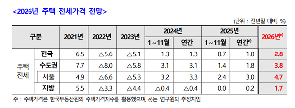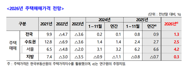 ÁÖÅûê¾÷¿¬±¸¿ø(ÀÌÇÏ Áֻ꿬)Àº ÀÌ´Þ 23ÀÏ ‘2026³â ÁÖÅýÃÀå Àü¸Á°ú Á¤Ã¥¹æÇâ’À» ÁÖÁ¦·Î ÇÑ °£´ãȸ¿¡¼ ³»³â ÁÖÅà ¸Å¸Å°¡°ÝÀº 1.3% ¿À¸£°í ¼öµµ±Ç°ú Áö¹æ ¿ª½Ã °¢°¢ 2.5%, 0.3% »ó½ÂÇÒ °ÍÀ¸·Î ¿¹»óÇß´Ù. ƯÈ÷ ¼¿ïÀº À̺¸´Ù ³ôÀº 4.2% »ó½ÂÇÒ °ÍÀ¸·Î ºÃ´Ù.