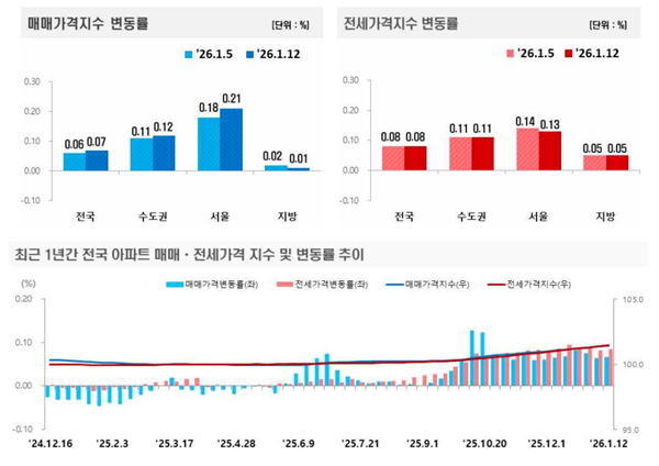 [¾ÆÀ¯°æÁ¦=±ÇÇýÁø ±âÀÚ] ÃÖ±Ù Çѱ¹ºÎµ¿»ê¿øÀÌ ¹ßÇ¥ÇÑ ‘ÁÖ°£¾ÆÆÄÆ® °¡°Ýµ¿Çâ’¿¡ µû¸£¸é 2026³â 1¿ù 2ÁÖ(Áö³ 12ÀÏ ±âÁØ) Àü±¹ ¾ÆÆÄÆ®°ªÀº »ó½Â(0.07%)À» ±â·ÏÇß´Ù. ¼öµµ±Ç°ú ¼¿ï, Áö¹æ ¸ðµÎ »ó½ÂÇß´Ù.