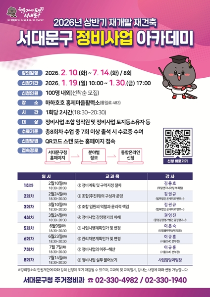 [¾ÆÀ¯°æÁ¦=Á¶¸íÀÇ ±âÀÚ] ¼¿ï ¼´ë¹®±¸´Â Àç°³¹ß¤ýÀç°ÇÃà µî µµ½ÃÁ¤ºñ»ç¾÷¿¡ ´ëÇÑ ÁֹεéÀÇ ÀÌÇØ¸¦ µ½±â À§ÇØ ¿ÃÇØ »ó¹Ý±â¿¡µµ ‘Á¤ºñ»ç¾÷ ¾ÆÄ«µ¥¹Ì’¸¦ ÁøÇàÇÑ´Ù°í ÃÖ±Ù ¹àÇû´Ù.