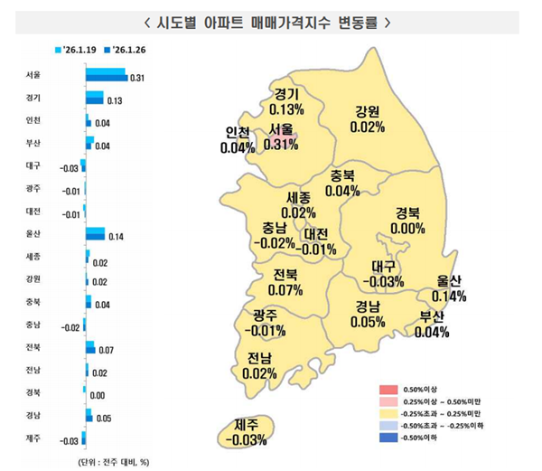 [¾ÆÀ¯°æÁ¦=±ÇÇýÁø ±âÀÚ] ÃÖ±Ù Çѱ¹ºÎµ¿»ê¿øÀÌ ¹ßÇ¥ÇÑ ‘ÁÖ°£¾ÆÆÄÆ® °¡°Ýµ¿Çâ’¿¡ µû¸£¸é 2026³â 1¿ù 4ÁÖ(Áö³ 26ÀÏ ±âÁØ) Àü±¹ ¾ÆÆÄÆ®°ªÀº »ó½Â(0.1%)À» ±â·ÏÇß´Ù. ¼öµµ±Ç°ú ¼¿ï, Áö¹æ ¸ðµÎ »ó½ÂÇß´Ù.