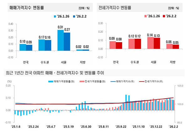 [¾ÆÀ¯°æÁ¦=±ÇÇýÁø ±âÀÚ] ÃÖ±Ù Çѱ¹ºÎµ¿»ê¿øÀÌ ¹ßÇ¥ÇÑ ‘ÁÖ°£¾ÆÆÄÆ® °¡°Ýµ¿Çâ’¿¡ µû¸£¸é 2026³â 2¿ù 1ÁÖ(Áö³ 2ÀÏ ±âÁØ) Àü±¹ ¾ÆÆÄÆ®°ªÀº »ó½Â(0.09%)À» ±â·ÏÇß´Ù. ¼öµµ±Ç°ú ¼¿ï, Áö¹æ ¸ðµÎ »ó½ÂÇß´Ù.