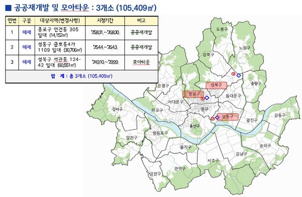 ´ë»óÁö´Â °ø°øÀç°³¹ß Èĺ¸Áö Ãë¼ÒµÈ Á¾·Î±¸ ¿¬°Çµ¿ 305 ÀÏ´ë(1¸¸4152§³)¿Í ¼ºµ¿±¸ ±ÝÈ£µ¿4°¡ 1109 ÀÏ´ë(3¸¸706§³), ¸ð¾ÆÅ¸¿î ´ë»óÁö¿¡¼ öȸµÈ ¼ººÏ±¸ ¼®°üµ¿ 124-42 ÀÏ´ë(6¸¸551§³) µîÀÌ´Ù.