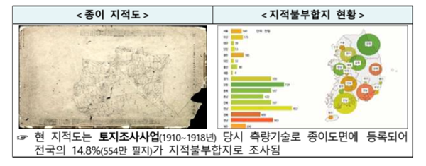 ÁöÀûÀçÁ¶»ç»ç¾÷Àº ¿À·¡µÈ Á¾ÀÌ ÁöÀûµµ¿Í ½ÇÁ¦ ÅäÁöÀÇ ¸éÀû¤ý°æ°è ÇöȲÀÌ ÀÏÄ¡ÇÏÁö ¾Ê´Â ÁöÀûºÒºÎÇÕÁö¸¦ ¹Ù·ÎÀâ´Â »ç¾÷ÀÌ´Ù. 2012³â ½ÃÀ۵Š2030³â±îÁö ÁøÇàµÈ´Ù. »ç¾÷ÀÌ ¿Ï·áµÇ¸é ±×°£ ¸éÀû¤ý°æ°è µîÀÌ ºÒºÐ¸íÇØ Àç»ê±Ç Çà»ç¿¡ ¾î·Á¿ü´ø ºÒÆíÀÌ ÇØ¼ÒµÇ°í ÅäÁö °¡Ä¡°¡ »ó½ÂÇÏ´Â È¿°ú°¡ ÀÖ´Ù.