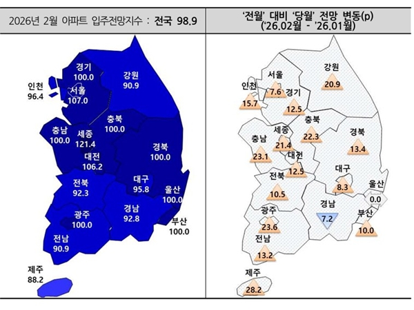 ¼öµµ±Ç ÀÔÁÖÀü¸ÁÁö¼ö´Â 101.3·Î Àü¿ù(89.4)°ú ºñ±³ÇØ 11.9p »ó½ÂÇß´Ù. ¼¿ïÀº 107.6À¸·Î Àü¿ù(100) ´ëºñ 7.6p, ÀÎõÀº 96.4·Î Àü¿ù(80.7) ´ëºñ 15.7p, °æ±â´Â 100À¸·Î Àü¿ù(87.5) ´ëºñ 12.5p °¢°¢ ¿À¸£¸ç Áö³´Þ(2025³â 12¿ù)¿¡ À̾î Å« Æø »ó½ÂÇß´Ù. ƯÈ÷ °æ±â ÀÔÁÖÀü¸ÁÁö¼ö°¡ Áö³ÇØ 7¿ù 118.7À» ±â·ÏÇÑ µÚ 7°³¿ù ¸¸¿¡ 100À» ±â·ÏÇß´Ù.