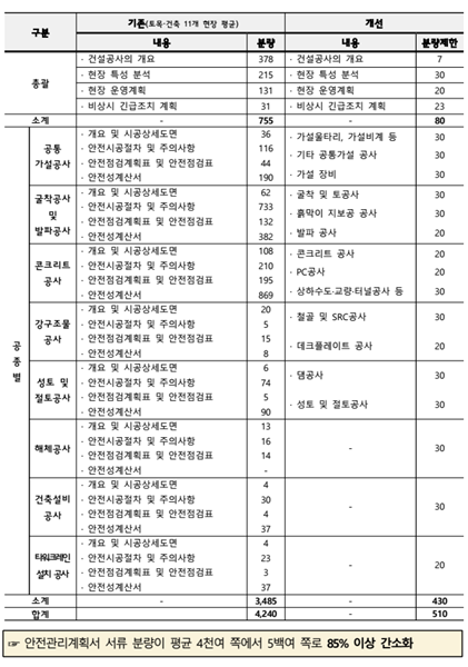 ¶Ç °èȹ¼ ³» Áߺ¹¤ýÀ¯»ç ³»¿ë, ¾ÈÀü°ü¸®°èȹ¼¿Í °ü·Ã ¾ø´Â ³»¿ë, ´Ü¼ø ¹ý·É Á¦½Ã µî ºÒÇÊ¿äÇÑ ³»¿ëÀ» »èÁ¦Çϰí Ç׸ñº° ÃÖ´ë ºÐ·®À» Á¦ÇÑÇØ Æò±Õ 4000¿© ÂÊ¿¡ ´ÞÇÏ´ø °èȹ¼¸¦ 500¿© ÂÊÀ¸·Î °£¼ÒÈÇß´Ù. ÇöÀå¿¡¼´Â ÃÖ´ë 80ÂÊÀÇ º»Æí À§ÁÖ·Î ½ÇÁ¦ ¾ÈÀü °ü¸®¿¡ Ȱ¿ëÇϰí, ¼³°èµµ¼ µîÀº ºÎ·ÏÀ¸·Î ºÐ¸®ÇØ º°µµ °ËÅä ½Ã¿¡¸¸ Ȱ¿ëÅä·Ï Çß´Ù.