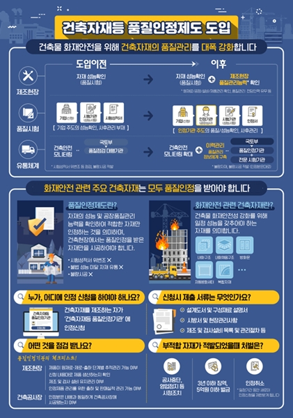 °ÇÃàÀÚÀçǰÁúÀÎÁ¤Á¦µµ´Â ÈÀç ¾ÈÀü¼ºÀÌ Áß¿äÇÑ °ÇÃàÀÚÀç¿¡ ´ëÇØ ¸íÈ®ÇÑ ¼º´É±âÁØÀ» Á¦½ÃÇÏ°í ±âÁØ¿¡ ¸Â°Ô Á¦Á¶¤ý½Ã°øÇϵµ·Ï °ü¸®ÇÏ´Â Á¦µµ´Ù. Çѱ¹°Ç¼³±â¼ú¿¬±¸¿øÀÌ Ç°ÁúÀÎÁ¤±â°üÀ¸·Î ÁöÁ¤µÅ ³»È±¸Á¶, ¹æÈ¹®, ÀÚµ¿¹æÈ¼ÅÅÍ, ³»Èä¿ò±¸Á¶, º¹ÇÕÀÚÀç(»÷µåÀ§Ä¡ÆÐ³Î) µî 5°³ °ÇÃàÀÚÀç¿¡ ´ëÇÑ Ç°ÁúÀÎÁ¤¼¸¦ ¹ß±ÞÇϰí Á¦Á¶°øÀå¤ý½Ã°ø ÇöÀåÀ» Á¡°ËÇϰí ÀÖ´Ù.