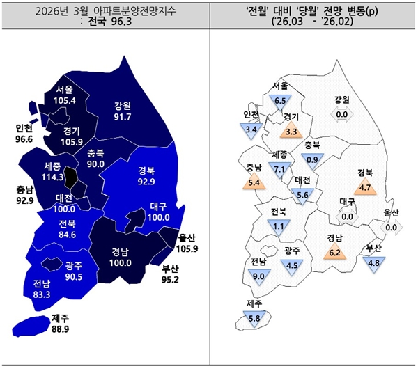 ¼öµµ±Ç ÀÔÁÖÀü¸ÁÁö¼ö´Â 102.6À¸·Î Àü¿ù(104.8)º¸´Ù 2.2p Ç϶ôÇß´Ù. ¼¿ïÀº 105.4·Î Àü¿ù(111.9)º¸´Ù 6.5p, ÀÎõÀº 96.6À¸·Î Àü¿ù(100)º¸´Ù 3.4p ³»·È°í °æ±â´Â 105.9·Î Àü¿ù(102.6)º¸´Ù 3.3p ¿À¸£¸ç »ó½Â Àü¸ÁµÆ´Ù.