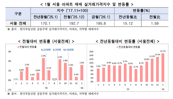 ÃÖ±Ù ¼¿ï½Ã¿¡ µû¸£¸é ÀÌ´Þ Çѱ¹ºÎµ¿»ê¿øÀÌ °øÇ¥ÇÑ ¿ÃÇØ 1¿ù ¼¿ï ¾ÆÆÄÆ® ¸Å¸Å ½Ç°Å·¡°¡°ÝÀº Àü¿ù(2025³â 12¿ù) ´ëºñ 1.59% »ó½ÂÇßÀ¸¸ç, Àü³â µ¿¿ù°ú ºñ±³Çϸé 15.12%ÀÇ »ó½Â ÆøÀ» ±â·ÏÇß´Ù.