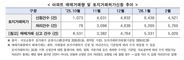 ¿ÃÇØ 2¿ù ¸» ±âÁØ ¾ÆÆÄÆ® ÅäÁö°Å·¡Çã°¡ ½Å±Ô ½Åû°Ç¼ö´Â Àü¿ù ´ëºñ 29.8% °¨¼ÒÇÑ 4521°ÇÀ̸ç, ÀÌÁß Ã³¸®µÈ °Ç¼ö´Â 5765°ÇÀ¸·Î Áý°èµÆ´Ù. ¼¿ï Àü¿ª¿¡¼ ÅäÁö°Å·¡Çã°¡Á¦°¡ ½ÃÇàµÈ ÈÄ Áö³ 2¿ù ¸» ±âÁØ ´©Àû ½Åû °Ç¼ö´Â ÃÑ 2¸¸895°ÇÀ¸·Î, ÀÌ Áß 90.2%ÀÎ 1¸¸8846°ÇÀÌ Ã³¸®µÆ´Ù.