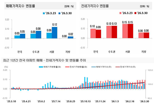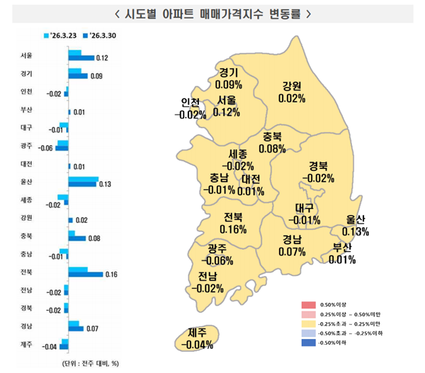 [¾ÆÀ¯°æÁ¦=±ÇÇýÁø ±âÀÚ] ÃÖ±Ù Çѱ¹ºÎµ¿»ê¿øÀÌ ¹ßÇ¥ÇÑ ‘ÁÖ°£¾ÆÆÄÆ® °¡°Ýµ¿Çâ’¿¡ µû¸£¸é 2026³â 3¿ù 5ÁÖ(Áö³ 3¿ù 30ÀÏ ±âÁØ) Àü±¹ ¾ÆÆÄÆ®°ªÀº »ó½Â(0.05%)À» ±â·ÏÇß´Ù. ¼öµµ±Ç°ú ¼¿ï, Áö¹æ ¸ðµÎ »ó½ÂÇß´Ù.