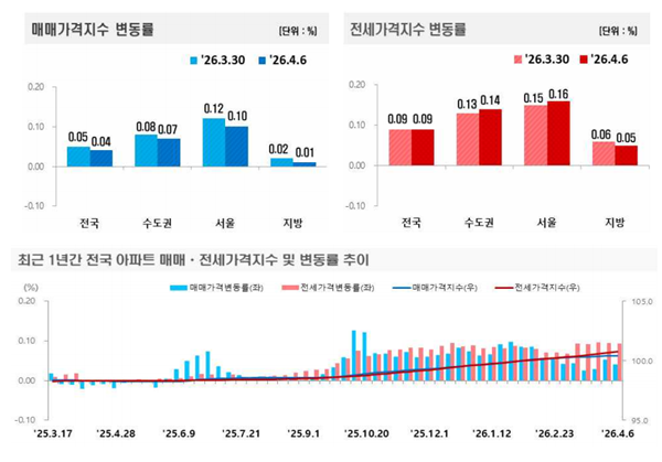 [¾ÆÀ¯°æÁ¦=±ÇÇýÁø ±âÀÚ] ÃÖ±Ù Çѱ¹ºÎµ¿»ê¿øÀÌ ¹ßÇ¥ÇÑ ‘ÁÖ°£¾ÆÆÄÆ® °¡°Ýµ¿Çâ’¿¡ µû¸£¸é 2026³â 4¿ù 1ÁÖ(Áö³ 6ÀÏ ±âÁØ) Àü±¹ ¾ÆÆÄÆ®°ªÀº »ó½Â(0.04%)À» ±â·ÏÇß´Ù. ¼öµµ±Ç°ú ¼¿ï, Áö¹æ ¸ðµÎ »ó½ÂÇß´Ù.