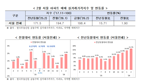 ÀÌ´Þ 20ÀÏ ¼¿ï½Ã°¡ Çѱ¹ºÎµ¿»ê¿øÀÌ °øÇ¥ÇÑ ¿ÃÇØ 2¿ù ¼¿ï ¾ÆÆÄÆ® Åë°è¸¦ ºÐ¼®ÇÑ °á°ú¿¡ µû¸£¸é ¾ÆÆÄÆ® ¸Å¸Å ½Ç°Å·¡°¡°ÝÀº Àü¿ù ´ëºñ 1.9% »ó½ÂÇßÀ¸¸ç, Àü³â µ¿¿ù°ú ºñ±³Çϸé 15.7% ¿À¸¥ ¼öÄ¡´Ù.