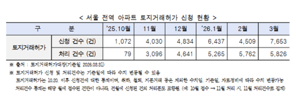 ÀÌ´Þ 21ÀÏ ¼¿ï½Ã¿¡ µû¸£¸é Áö³´Þ(3¿ù) ¸» ±âÁØ ¾ÆÆÄÆ® ÅäÁö°Å·¡Çã°¡ ½Å±Ô ½Åû °Ç¼ö´Â Àü¿ù(4509°Ç) ´ëºñ 69.7% ±ÞÁõÇÑ 7653°ÇÀ» ±â·ÏÇß´Ù. Áö³ÇØ 10¿ù ¼¿ï Àü¿ª ÅäÁö°Å·¡Çã°¡Á¦ ½ÃÇà ÀÌÈÄ ¿ÃÇØ 3¿ù ¸»±îÁö ´©Àû ½Åû°Ç¼ö´Â ÃÑ 2¸¸8535°ÇÀ̸ç, ÀÌÁß 2¸¸4669°Ç(86.5%)ÀÌ Ã³¸®µÆ´Ù.