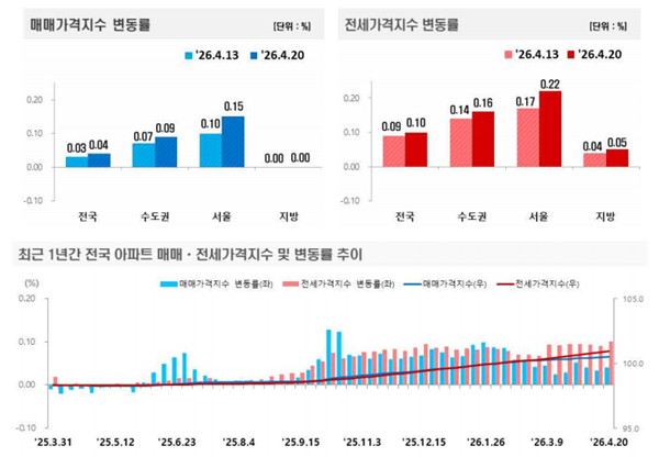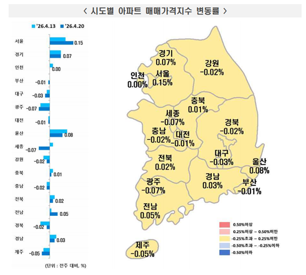 [¾ÆÀ¯°æÁ¦=±ÇÇýÁø ±âÀÚ] ÃÖ±Ù Çѱ¹ºÎµ¿»ê¿øÀÌ ¹ßÇ¥ÇÑ ‘ÁÖ°£¾ÆÆÄÆ® °¡°Ýµ¿Çâ’¿¡ µû¸£¸é 2026³â 4¿ù 3ÁÖ(Áö³ 20ÀÏ ±âÁØ) Àü±¹ ¾ÆÆÄÆ®°ªÀº »ó½Â(0.04%)À» ±â·ÏÇß´Ù. ¼öµµ±Ç°ú ¼¿ïÀº »ó½Â, Áö¹æÀº º¸ÇÕÀ» ³ªÅ¸³Â´Ù.